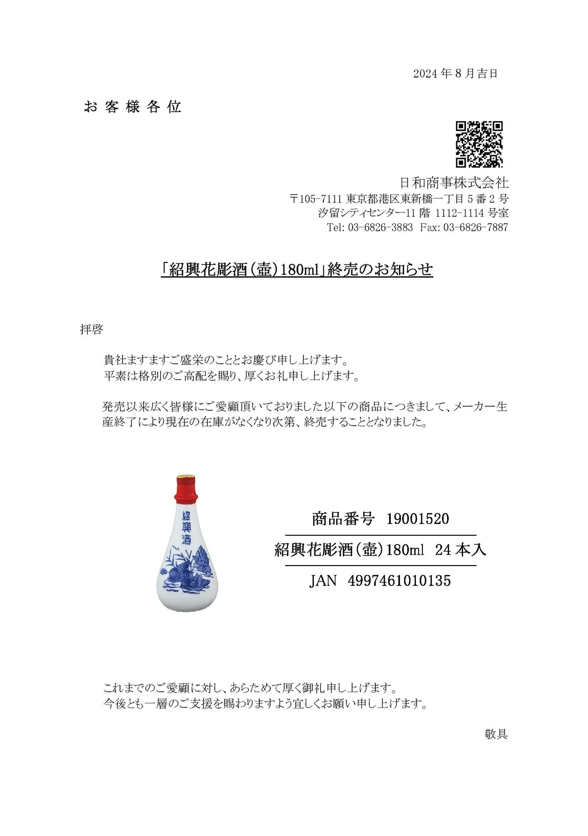【終売のお知らせ】紹興花彫酒(壺)180ml 9月2日 著者 S Nichiwa 発売以来広く皆様にご愛顧頂いておりました以下の商品につきまして、メーカー生産終了により終売することとなりました。商品番号 19001520紹興花彫酒(壺)180mlJAN コード4997461010135詳細につきましては、こちらの文章をお読みくださいませ。 S Nichiwa