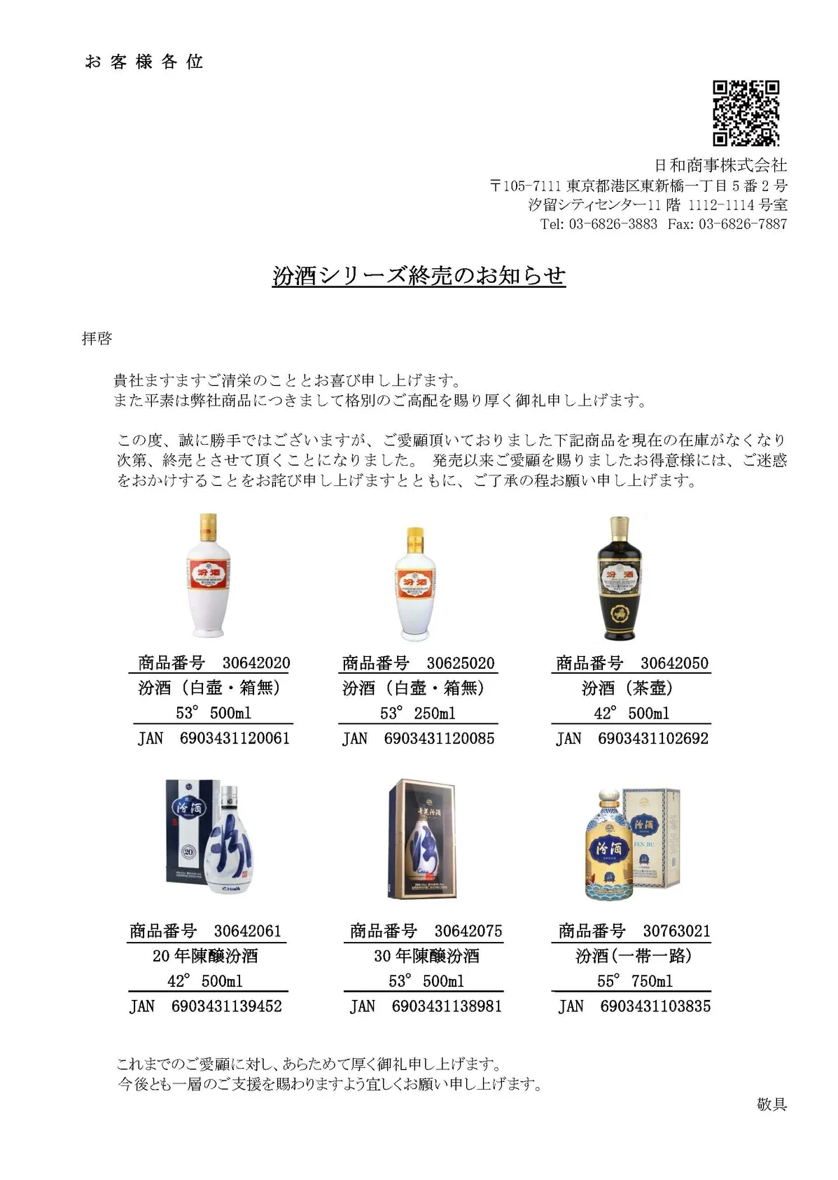 【汾酒シリーズ】終売のお知らせ 11月15日 著者 S Nichiwa この度、誠に勝手ではございますが、ご愛顧頂いておりました汾酒シリーズを現在の在庫がなくなり次第、終売とさせて頂くことになりました。 発売以来ご愛顧を賜りましたお得意様には、ご迷惑をおかけすることをお詫び申し上げますとともに、ご了承の程お願い申し上げます。 S Nichiwa
