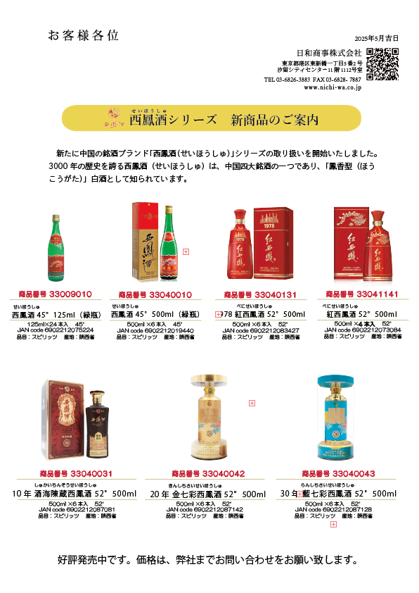 西鳳酒シリーズ 新商品のご案内 5月29日 著者 S Nichiwa 新たに中国の銘酒ブランド「西鳳酒(せいほうしゅ)」シリーズの取り扱いを開始いたしました。3000 年の歴史を誇る西鳳酒(せいほうしゅ)は、中国四大銘酒の一つであり、「鳳香型(ほうこうがた)」白酒として知られています。好評発売中です。価格は、弊社までお問い合わせをお願い致します。 S Nichiwa