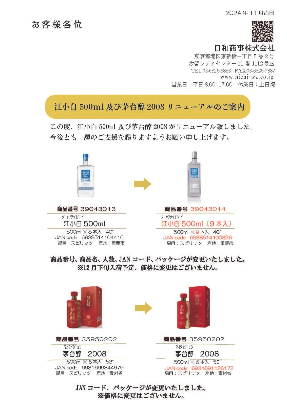 江小白500ml 及び茅台醇2008 リニューアルのご案内